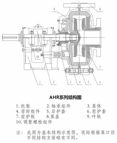 5.AHR型渣漿泵過(guò)流部件為橡膠材料。適用于輸送細(xì)顆粒及腐蝕性渣漿。其泵體、泵蓋及傳動(dòng)部件等與AH型泵通用。